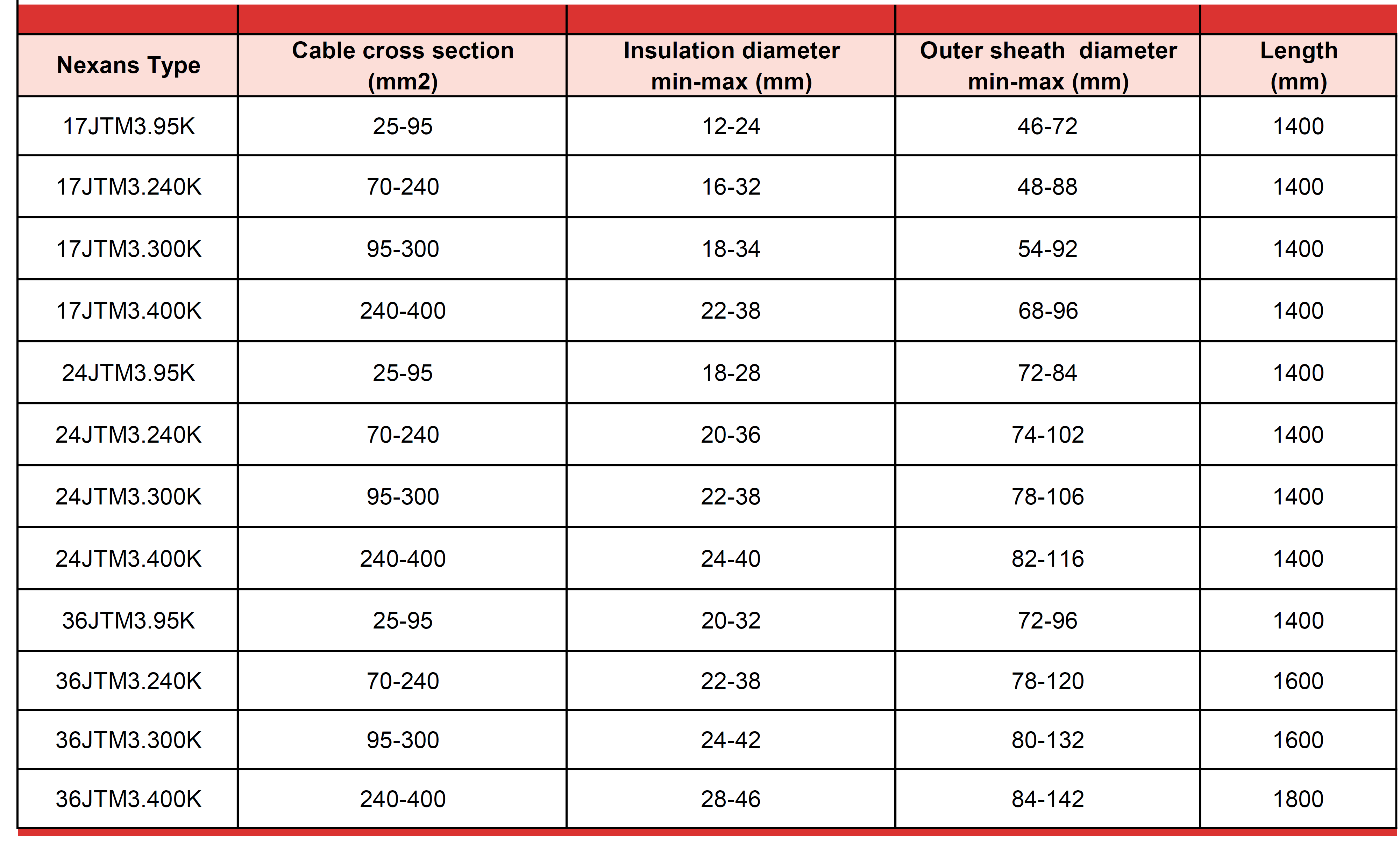 JTM3 K heat-shrink transition joints are designed to connect three core plastic insulated cables with Cu wire screen armored and three paper insulated armored PILC (1 Lead) cables.