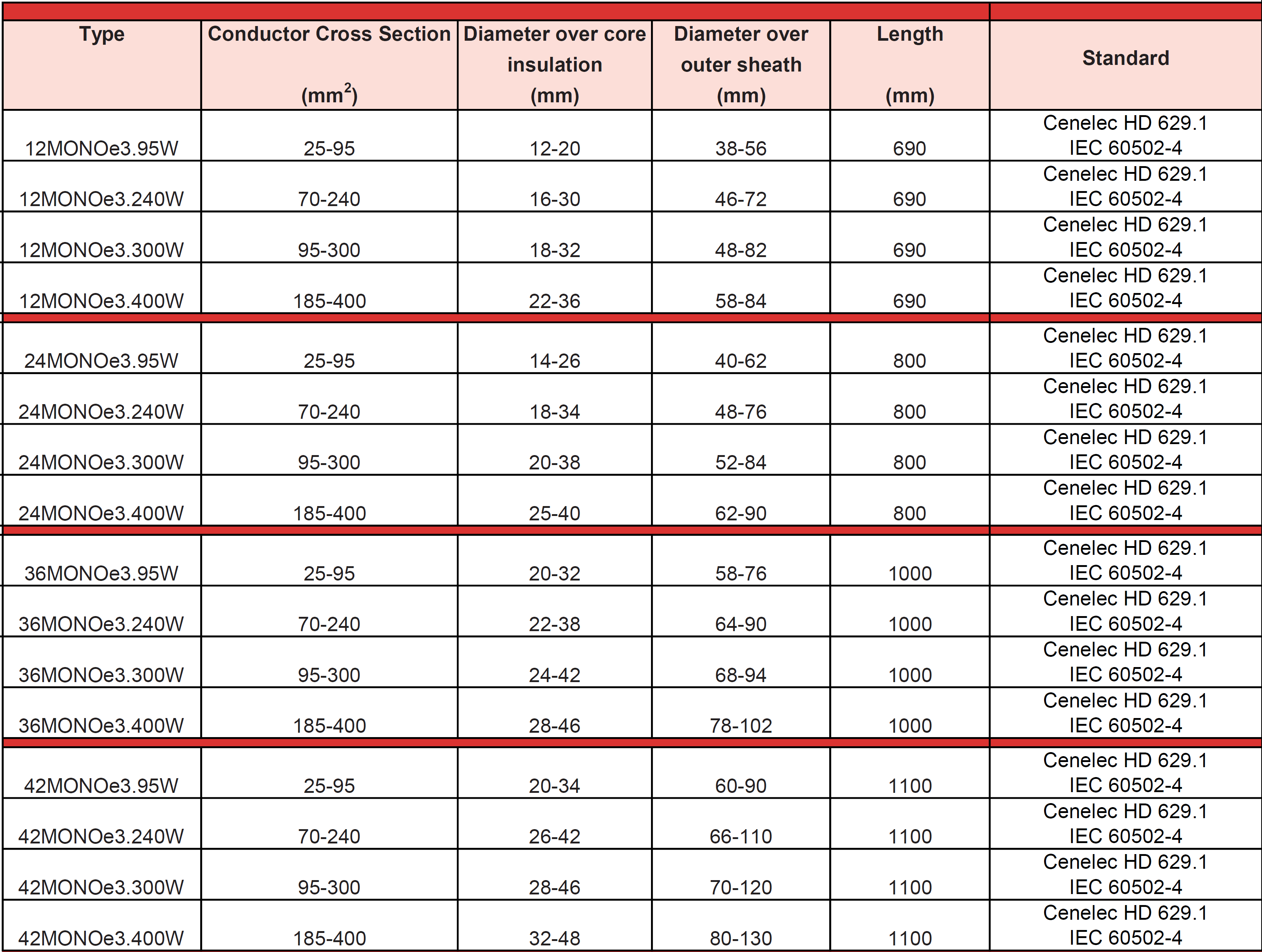 The ‘’MONOe3 W’’ outdoor terminations are designed for max system voltages of 42 kV. Easy, quick to install, reducing installation time and errors. The kit consists of a stress control mastic pad, a co extruded dual wall tube and red anti-tracking sealing mastic. Red anti-tracking break-out and red anti-tracking tubes “GT2” with adjustable length “D” are included in the kit. Anti-tracking rain sheds are supplied to withstand outdoor enviroments. The design accommodates various conductor lugs. MC types are supplied with “GPH” mechanical conductor lugs