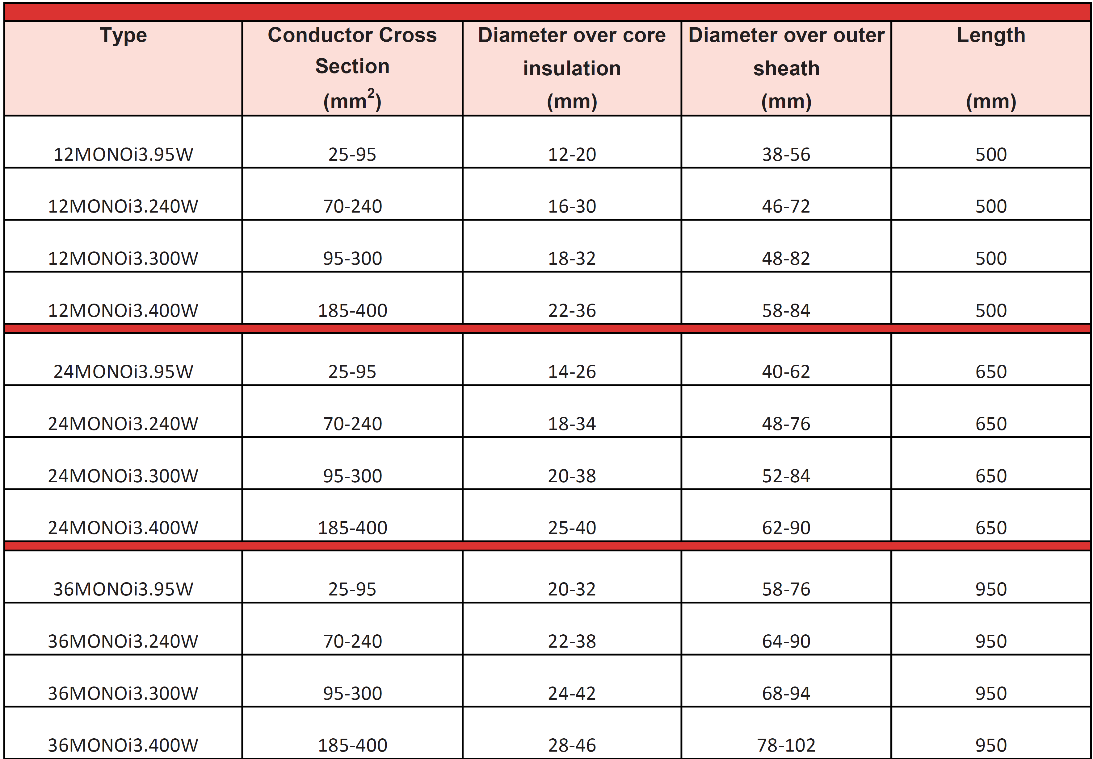 The ‘’MONOi3 W’’ indoor terminations are designed for max system voltages of 42 kV, for compact switchgears as well as for installations where space is limited. Easy, quick to install, reducing installation time and errors. The kit consists of a stress control mastic pad, a co extruded dual wall tube and red anti-tracking sealing mastic. Red anti-tracking break-out and red anti-tracking tubes “GT2” with adjustable length “D” are included in the kit. The design accommodates various conductor lugs. MC types are supplied with “GPH” mechanical conductor lugs Right angle or straight heat-shrinkable boots are available on request.