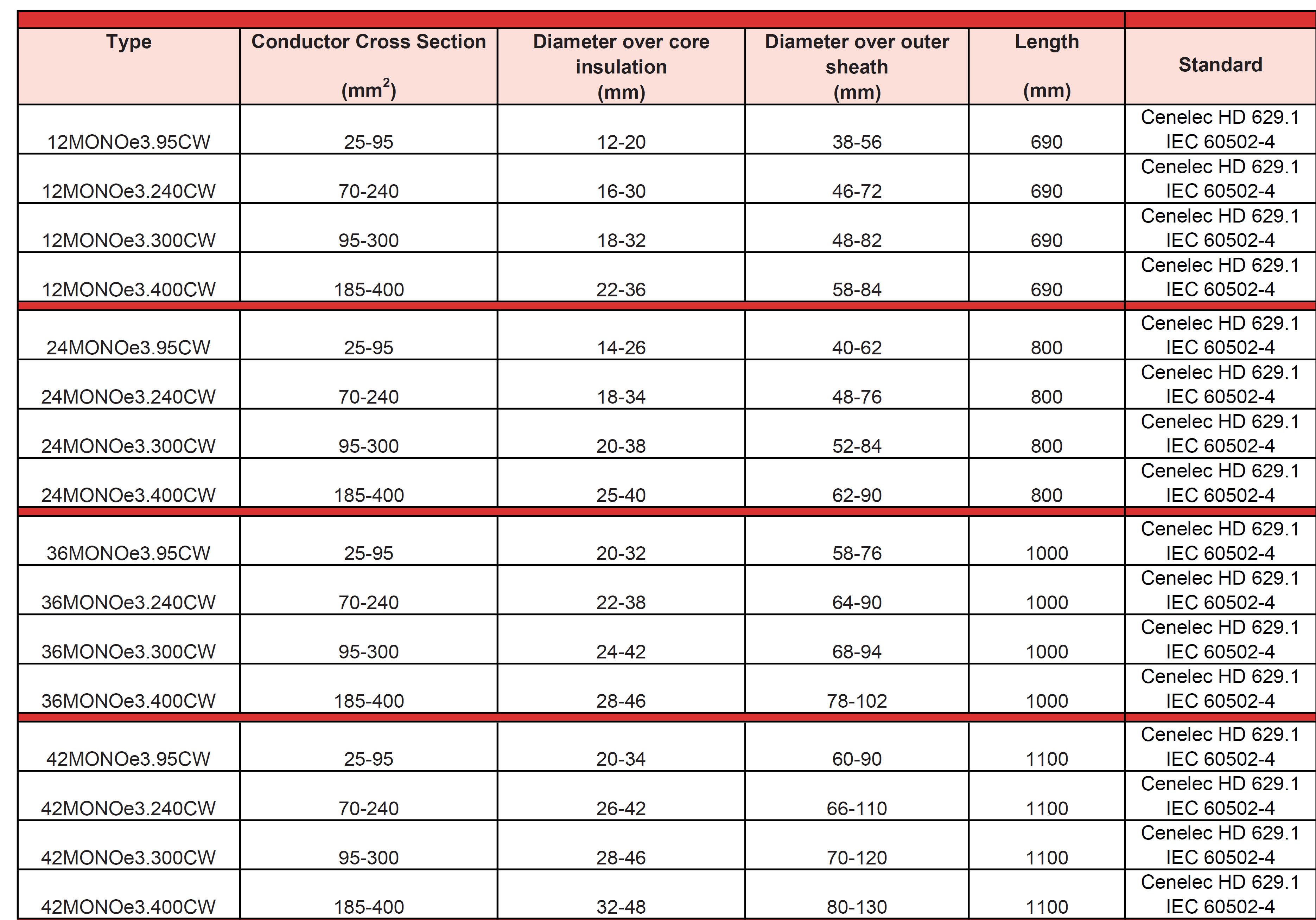 The ‘’MONOe3 CW’’ outdoor terminations are designed for max system voltages of 42 kV. Easy, quick to install, reducing installation time and errors. The kit consists of a stress control mastic pad, a co extruded dual wall tube and red anti-tracking sealing mastic. Red anti-tracking break-out and red anti-tracking tubes “GT2” with adjustable length “D” are included in the kit. Anti-tracking rain sheds are supplied to withstand outdoor enviroments. The design accommodates various conductor lugs. MC types are supplied with “GPH” mechanical conductor lugs.